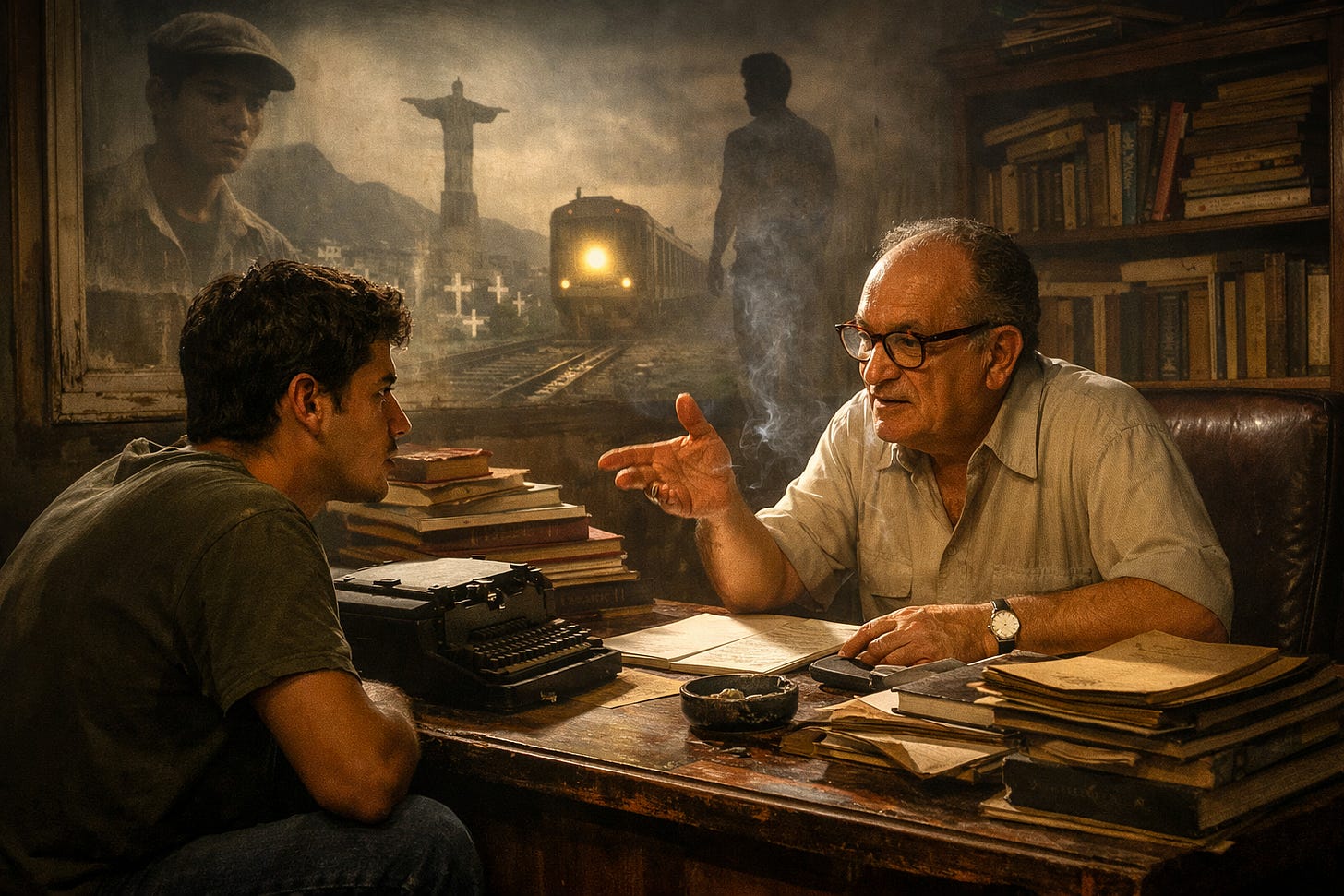 # 26 - Um renomado escritor brasileiro encontra um jovem postulante. Um encontro inusitado e surreal em que histórias se cruzam